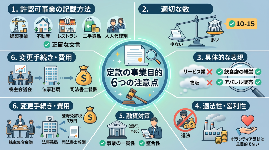 将来の事業展開も見据え、「明確性」「適法性」「営利性」の原則を守り、適切な数の目的を記載することが成功の鍵となります。