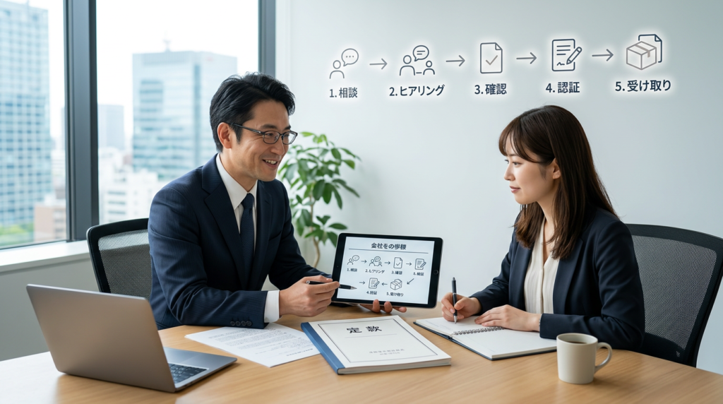 ここでは、実際に代行を依頼してから定款が完成するまでの一般的な流れを5つのステップに分けて具体的に解説します。