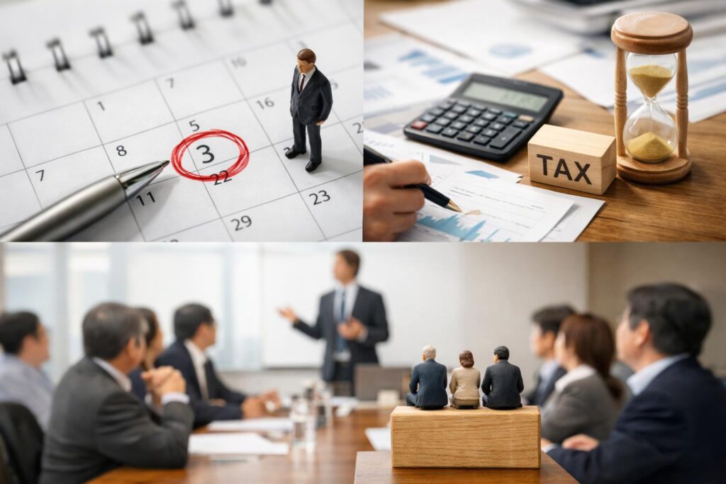 例えば、株主の中に海外在住者がいる場合や、特定の時期に多忙な方がいる場合は、その方々が出席しやすい時期に総会を開催できるよう、あらかじめ決算月を調整しておくといった配慮が求められます。